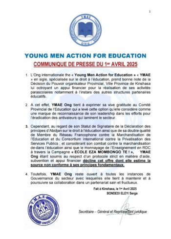 Tout en saluant l’initiative du comité provincial de l’éducation de la ville province de Kinshasa, l’ONG international Young Men Action for Education (YMAE), structure spécialisée sur [..]