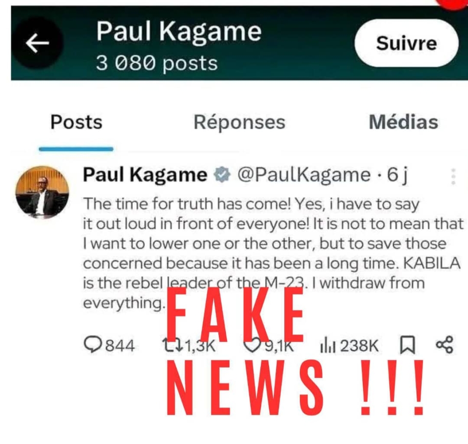 Une capture d’écran présentée comme un tweet du président rwandais Paul Kagame circule sur les réseaux sociaux depuis plusieurs jours. Le message lui attribue des propos affirmant que « Kabila est le chef rebelle du M23 » et qu’il se retirerait de tout. Rapidement devenue virale, cette publication suscite de nombreuses réactions et alimente des débats politiques en ligne. Pourtant, après vérification, ce message est faux et ne provient pas du compte officiel du président rwandais.